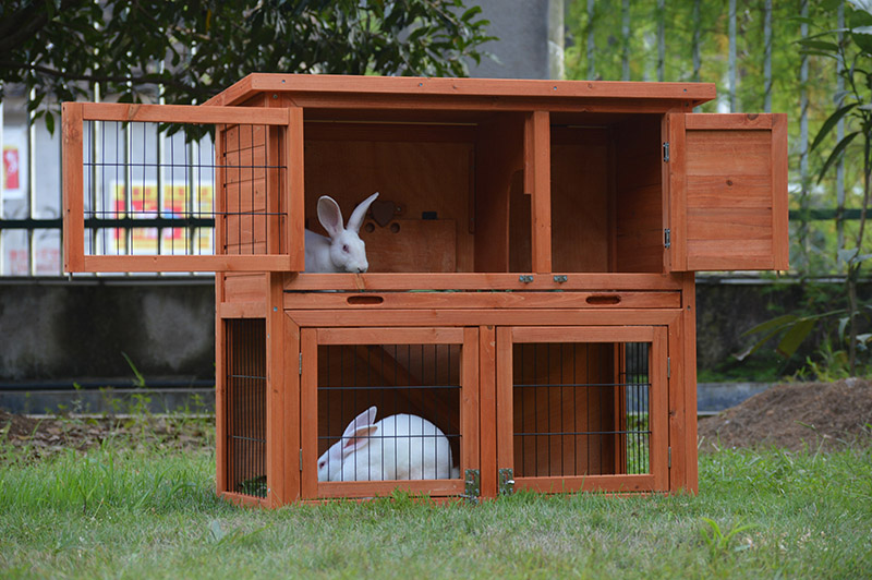 3. Two-Tiered Hutch: The hutch is divided into two levels, the upper level for resting and feeding, and the lower level for free movement. A ramp connects the two levels, allowing rabbits to move freely between them.